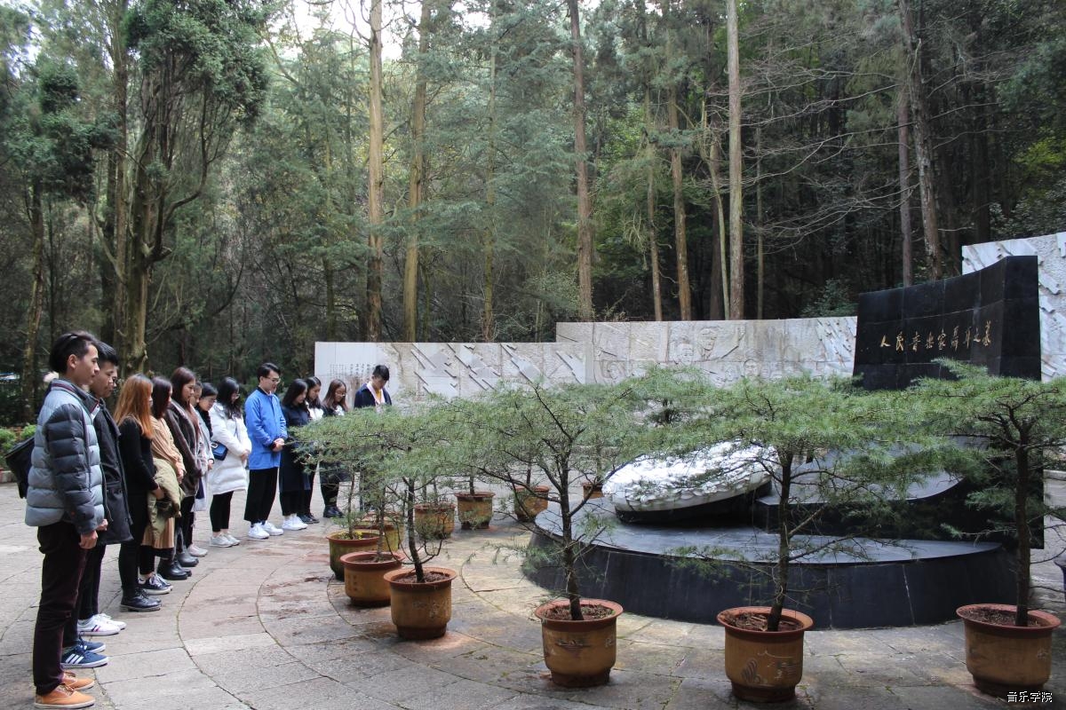第三站到达聂耳墓及聂耳纪念馆,聂耳墓位于昆明市西山景区内,平面布局为月琴形状。墓碑上镌刻着郭沫若题的“人民音乐家聂耳之墓”。中间屏风墙上,雕刻有以《义勇军进行曲》、万里长城和抗日救亡为主题的浮雕。左屏风墙上镶刻着郭沫若撰书的墓志铭;右屏风上,镶刻着田汉惊闻聂耳逝世时作的诗篇。同学们在聂耳墓前肃立默哀,为这位伟大的人民音乐家表示沉痛哀悼。