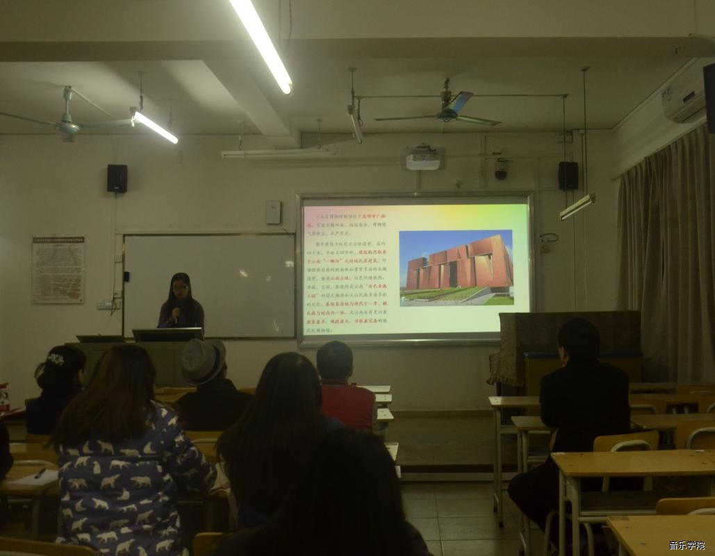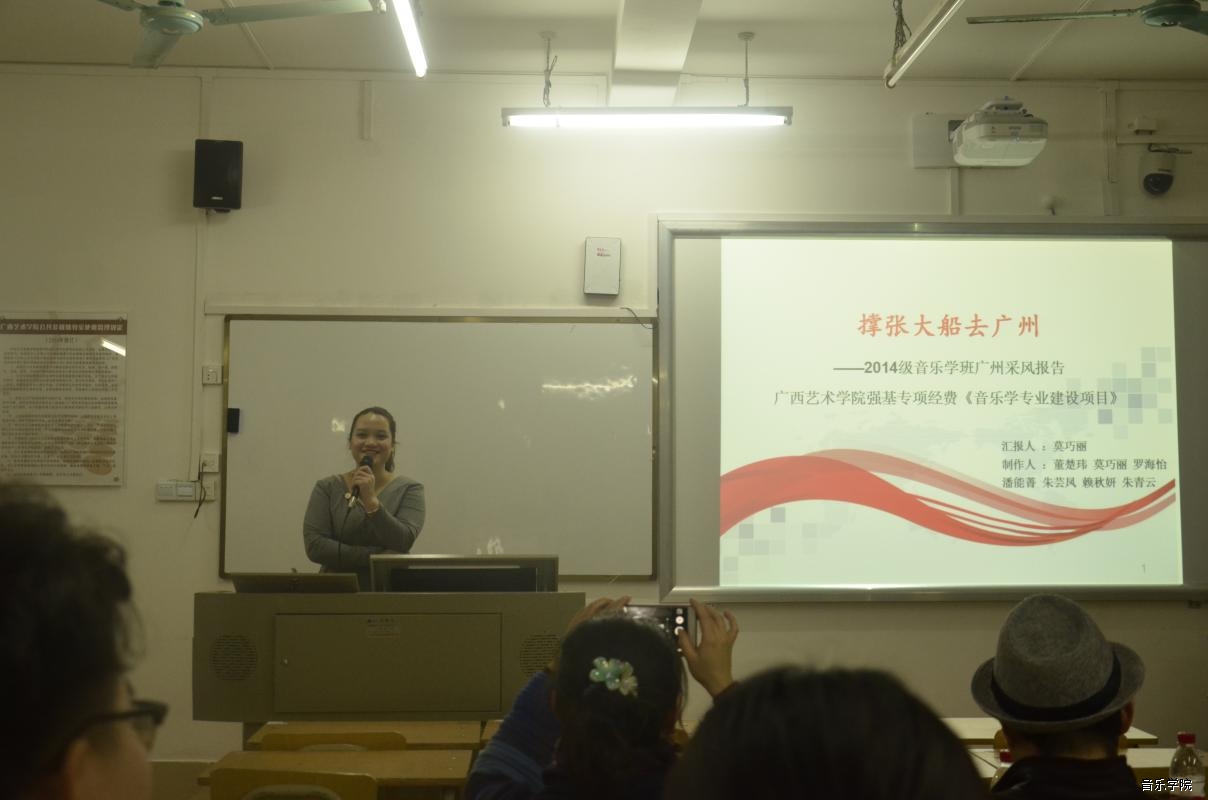 最后一部分,音乐学系2014级音乐学班广州采风汇报,以“撑张大船去广州”作为本次汇报的主题,2014级的几位同学相约于2016年11月18日-20日去到广州追寻不一样的文化。在汇报中给大家呈现了:古越之秀——西汉南越王墓博物馆、南越文明——南越王宫博物馆、古祠留芳--陈家书院、日新月异——广州城市文化等四个不同的景观,用大量的图文资料给大家做了介绍,对广州的文化有了初步的了解。