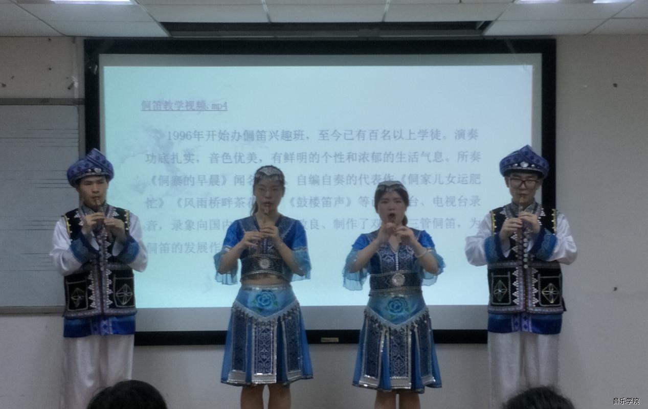 本次汇报展演在同学们制作的采风花絮视频中拉开序幕,而后围绕本次采风活动将其划分为三江侗族民间音乐、平果壮族嘹歌文化两大版块,以PPT讲解及成果汇报等形式进行展示。在侗族版块介绍中,同学们结合采录的风俗民情、特色建筑、饮食等元素配合多彩的民间音乐文化加以汇报,又为观众们呈现了精彩的侗族琵琶、芦笙、笛子与大歌表演。在第二版块壮族嘹歌文化讲解中,通过对三位坚守民族优秀文化传承阵地的老师们的故事讲述与有趣的问答环节还原,让在场的观众更为深切地感受到了平果壮乡人民对嘹歌的热爱及其音乐文化的独特魅力与丰厚的艺术价值。