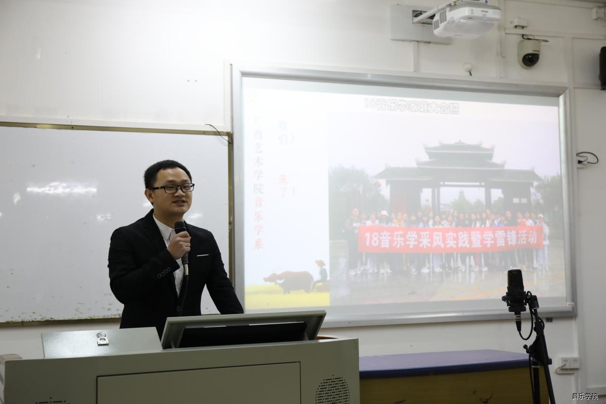 18级音乐学班带来的是在广西民族博物馆和扬美古镇进行田野采风的汇报。主讲人郑圣峰同学以“音乐学,你好”作为标题,讲述了作为大一新生对于音乐学专业初探的激动心情。在广西民族博物馆中,他们领略了广西不同于其他省市的特色多民族文化以及现代科技与民族相结合的壮族服饰展示;扬美古镇中,朴实的村民、恬静的美景与悠扬的平话民歌相融合,令他们心向神往、感受颇丰。主讲人最后提出“不忘初心,坚守使命”的口号响应标题,对未来的学习和生活表达期待,并坚守于心。18级同学的讲述,给在场的观众展示了属于音乐学新力量的积极面孔与活跃热情的青春气息。