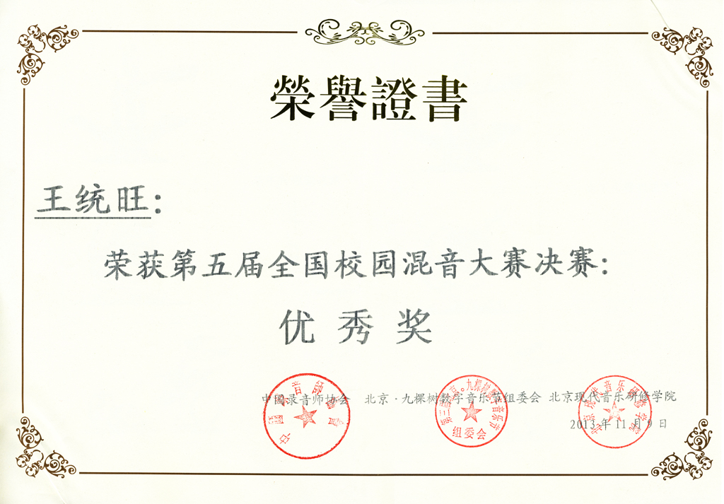 决赛评选内容是在规定的时间内选手独立完成由组委会指定的音乐作品《最美的意外》的缩混。我院录音艺术专业学生王统旺经过各位评委的评选,最终取得了第六名的名次,获得“优秀奖”的荣誉称号,同时,大赛组委会也为FUN乐天使官方网站颁发了“优秀组织奖”。