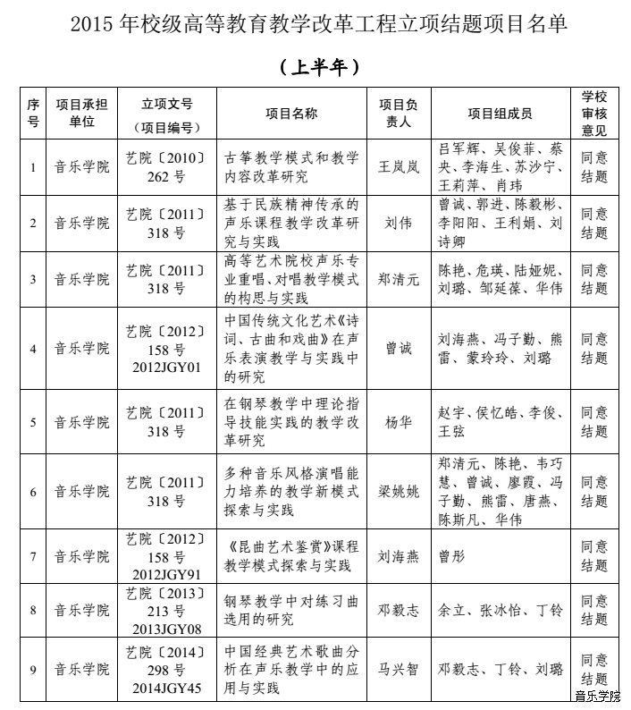 经各项目组申报,专家评审,由FUN乐天使官方网站教师承担的“古筝教学模式和教学内容改革研究”等11项校级高等教育教学改革工程立项项目结题,具体名单如下: