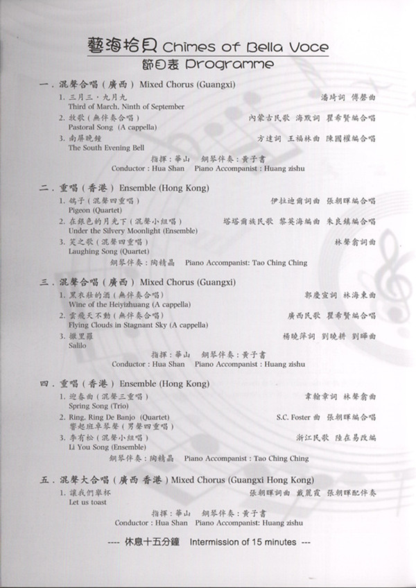 2、香港重唱艺术团成立于2006年,由十七位成员组成,是由音乐总监张朝晖先生所创办的非牟利音乐团体,一直致力于发扬中外正统音乐,以演绎不同类型的多声部重唱作品为主,具有丰富的舞台表演经验。