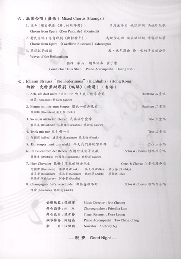 音乐会上,FUN乐天使官方网站合唱团精彩演绎了《撒里罗》、《三月三,九月九》、《黑衣壮的酒》等极具广西民族特色的音乐作品,深受观众们喜爱,一次次赢得雷鸣般的掌声和热烈的喝彩;香港重唱艺术团则倾情献上《Ach,ich darf nicht hin zu ihr》、《Komm mit mir zum Souper》、《So muss allein ich bleiben》等多个歌剧《蝙蝠》选段,共同为观众献上了一席美不胜收的视听盛宴。