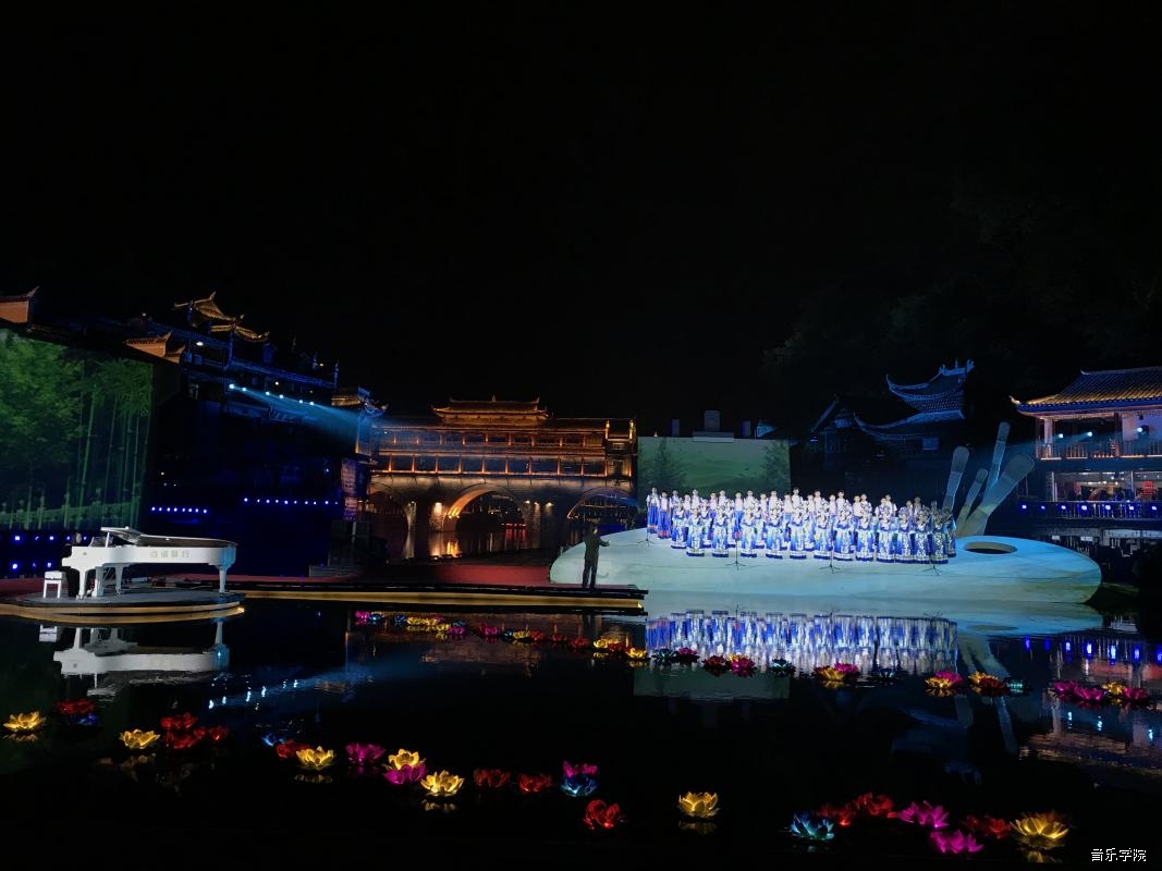 凤凰之夜晚会以凤凰古城吊脚楼和虹桥为主背景,游船为道具,沱江为舞台,融合湘西经典民族文化艺术、现代建筑投影、裸眼3D技术倾情打造。当晚,沱江两岸,灯光璀璨,古朴典雅的吊脚楼在夜色中显得色彩斑斓,流光溢彩,灯影照耀下的一切都显得极其美幻。我校合唱团以《我爱你,中国》、《撒里罗》两首作品在星辉斑斓里放歌,在光影交错中舞动,共同构筑起了一次“最古典”与“最当代”的对话,赢得了嘉宾观众的一致好评。