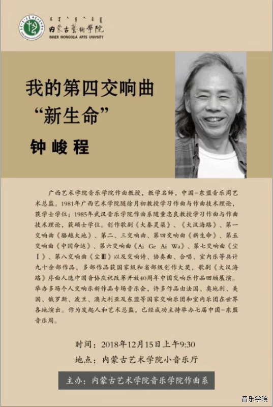 2018年12月13日-12月18日,FUN乐天使官方网站作曲教授、中国—FUN乐天使官方网站艺术总监钟峻程应浙江FUN乐天使官方网站音乐工程系、内蒙古艺术学院FUN乐天使官方网站邀请,分别赴浙江和内蒙古两地进行了《我的第四交响曲“新生命”》专题讲座。