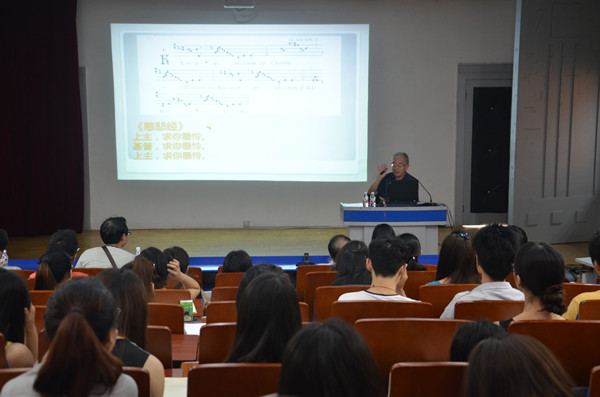 上午9时,余志刚教授的第一场讲座《欧洲早期音乐巡礼》准时开讲。余教授顺沿历史发展的脉络,以图、文、音、像四合一的方式对中世纪、文艺复兴、巴洛克、古典主义、浪漫主义以及现代主义时期的音乐代表人物、代表乐器及代表作品等依次进行了精辟的介绍,带领在场师生一同“游览”了精彩的西方早期音乐文化世界。