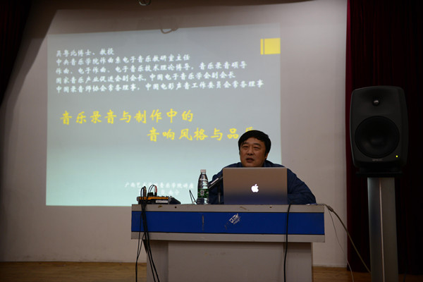讲座标题为《音乐录音与制作中的音响风格及品质把握》,由我院录音艺术专业副教授华伟老师主持。在三个多小时的讲座中,吴粤北教授为大家讲解了音响美学、制作工艺、缩混要领几大方面的内容。在音响美学模块中,吴老师重点以真实美与修饰美的辩证关系、客观再现——技术录音、主观呈现——艺术录音进行讲解,强调了艺术录音中音响美学的审美取向的重要性;在制作工艺模块中,吴老师以音乐会同期录音、录音棚录音制作、拟音与动效设计为要点,分别介绍了不同形式的音乐录音中的前期工作的关系和区别;在缩混要领模块中,吴老师以如何通过剪辑获取最佳版本、如何获得声音质感、如何把握时代与民族风格等内容生动形象的为大家介绍了后期制作在音乐录音中的重要性。随后,吴粤北教授还访问了录音艺术专业的苹果计算机教室、录音棚等实验场所,并对本专业的学科建设予以肯定。