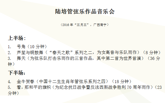 陈文皙:请您为我们做一个预告,向我们介绍一下明年三月三,由蔡央院长指挥广西交响乐团演绎您的作品音乐会的曲目好么?