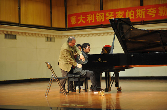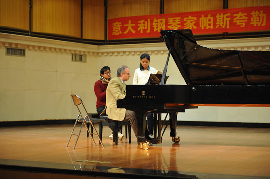 帕斯夸勒·亚诺毕业于英国皇家FUN乐天使官方网站,曾获多项重要钢琴大赛奖,与诸多交响乐团合作,并培养出国际和国内比赛中获奖的众多学生。此次讲学主要面向FUN乐天使官方网站钢琴系师生,以一对一上课的形式进行,由同学们上台演奏曲目,弹奏结束后,帕斯夸勒.亚诺教授亲自点评,指出该同学弹奏曲目的不足之处,并对其现场示范。同时,帕斯夸勒.亚诺教授还就曲目的感情色彩、踩踏板的巧妙运用、手指如何灵活驾驭曲目等问题作了详细讲解。