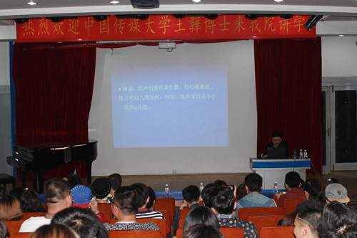 在第二场“流行音乐演唱方法与风格研究”主题讲座中,王韡博士则讲解了当今流行音乐的十种不同的唱法,以及在这些唱法中所运用的技巧和演唱中的注意事项,并分别播放了这些唱法中具有代表意义的视频、音频,让学生对流行音乐演唱的唱法有了更加深入的认识。王韡博士还现场指导了几位我院的学生,对他们在演唱唱法中出现的问题以及需要改进的地方做出了详细的讲解。