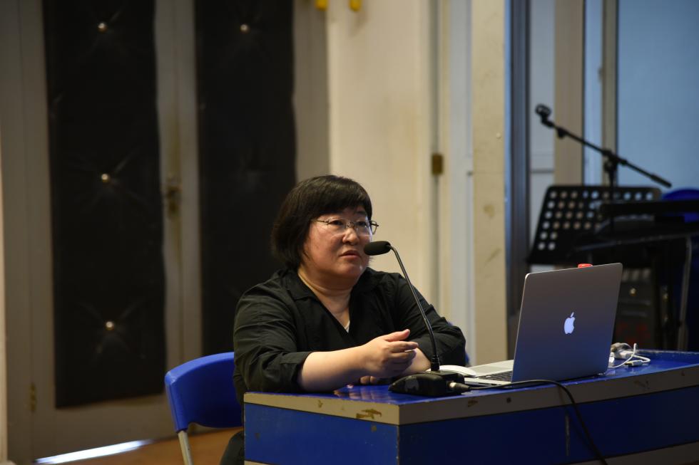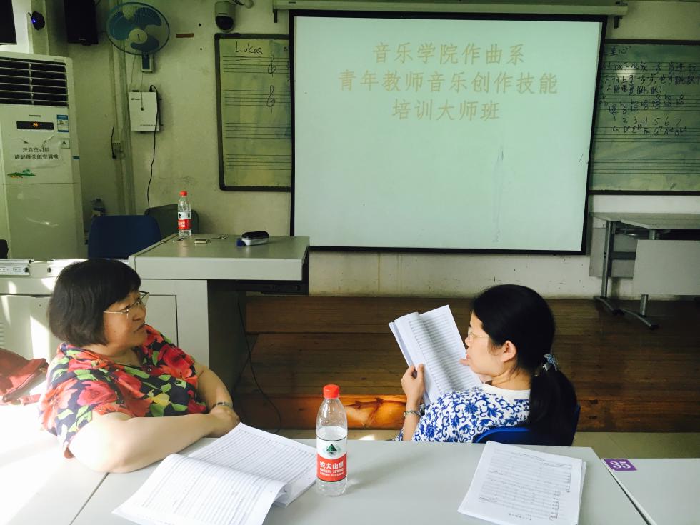 讲座上,各位青年教师非常荣幸地邀请陈怡博士聆听了各自的代表作品,其中包括丁铃教授的交响合唱《北部湾音诗》;邱玉兰老师的室内乐《青山不断歌不断》(为黑管、大管、弦乐、钢琴而作);邱庞阳洋老师的交响合唱《敢壮祭》(为合唱队、打击乐队、管弦乐队而作);李勋老师的室内乐《龙舟意象》(为童声、风笛、黑管、弦乐而作)、《渡劫》(为弦乐、长笛与钢琴而作)等。陈怡博士详细看完每一份总谱,认真聆听完每一部作品,并就作品中关于构思、文学内涵、结构、和声音响、节奏律动、配器等所出现的技术难题与在座教师进行了深入的分析、交流和探讨,并提出了宝贵的修改建议,现场气氛十分活跃。
