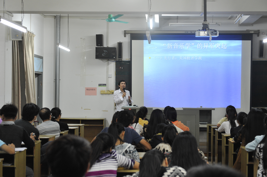 (图为杨柳成老师为我院师生作西方音乐研究学术报告)