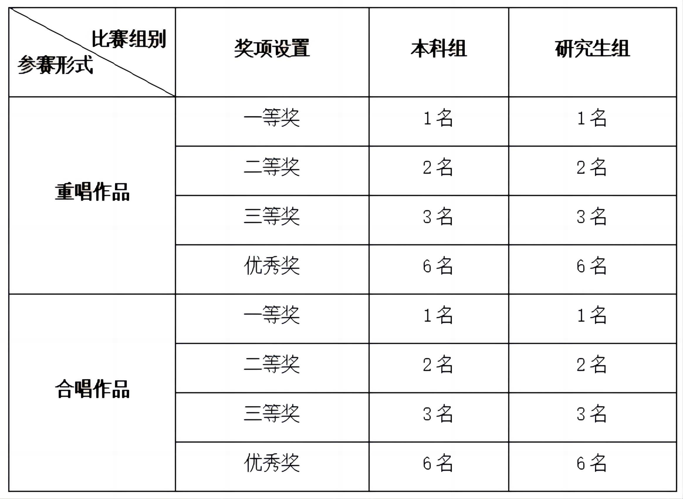 2.本届作曲比赛设重唱与合唱作品两种形式。重唱作品时间不超过4分钟,要求二重唱以上(含二重唱),每个声部只有一位演唱者。合唱作品时间不超过6分钟,要求不少于三声部,同声合唱或混声合唱均可。本届比赛不接受童声合唱作品。