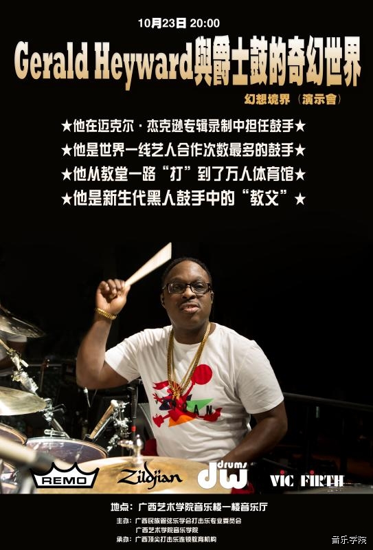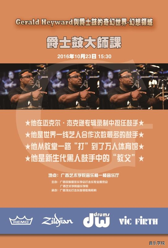 【2016年10月23日大师课、展示会】Gerald Heyward与爵士鼓的奇幻世界 来源: 作者: 更新时间:2016-10-19 16:39:27 浏览次数: 次 【字体:小 大】 分享到: 【打印正文】