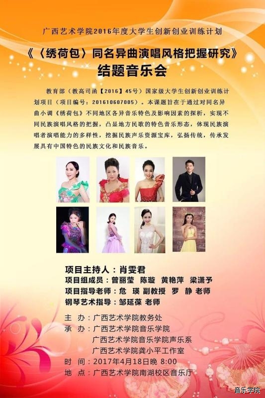 【2017年4月18日音乐会】《<绣荷包>同名异曲演唱风格把握研究》结题音乐会 来源: 作者: 更新时间:2017-04-15 09:18:39 浏览次数: 次 【字体:小 大】 分享到: 【打印正文】
