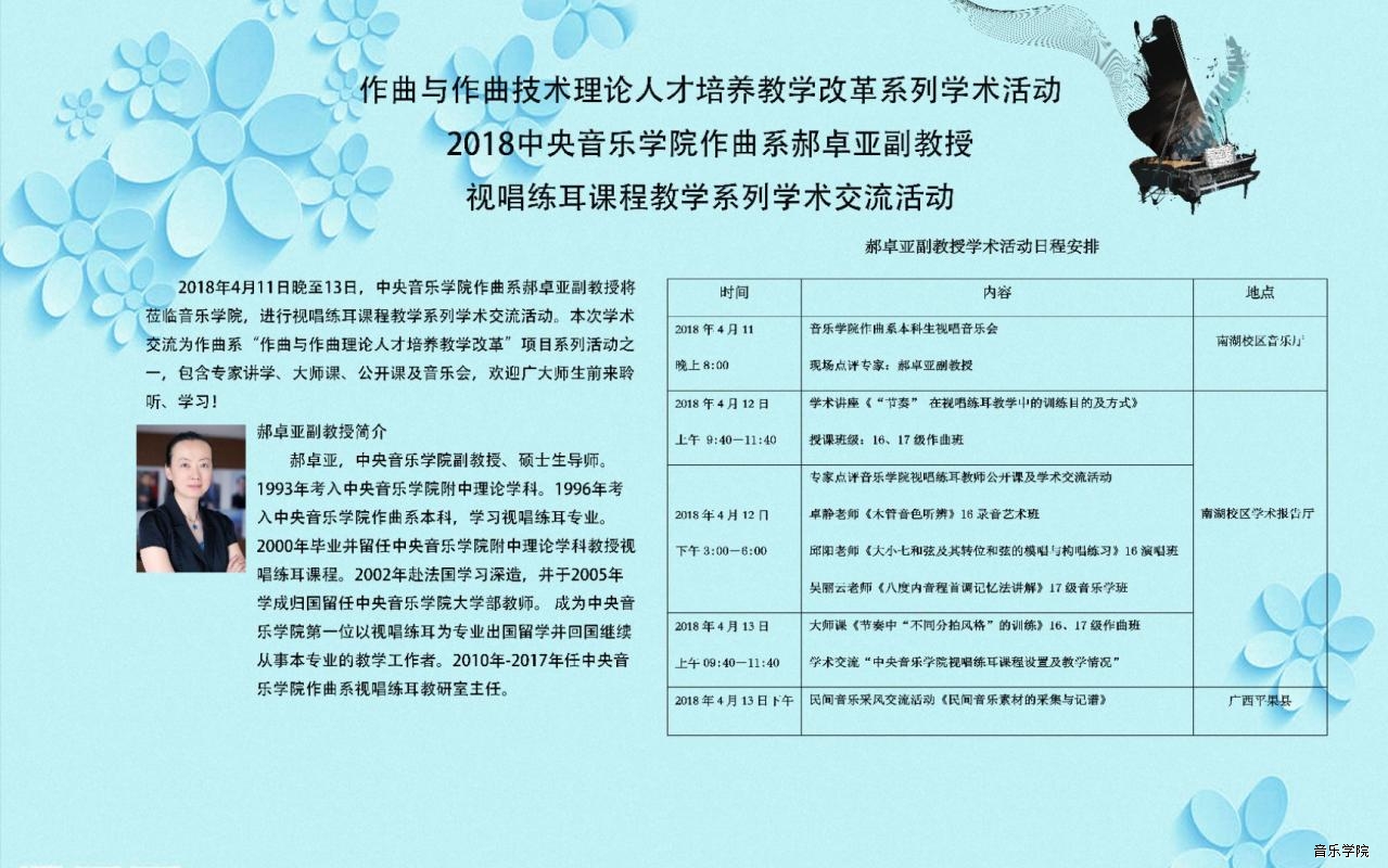 【2018年4月11-13日学术活动】中央FUN乐天使官方网站作曲系郝卓亚副教授视唱练耳课程教学系列学术交流活动 来源: 作者: 更新时间:2018-04-04 09:32:50 浏览次数: 次 【字体:小 大】 分享到: 【打印正文】